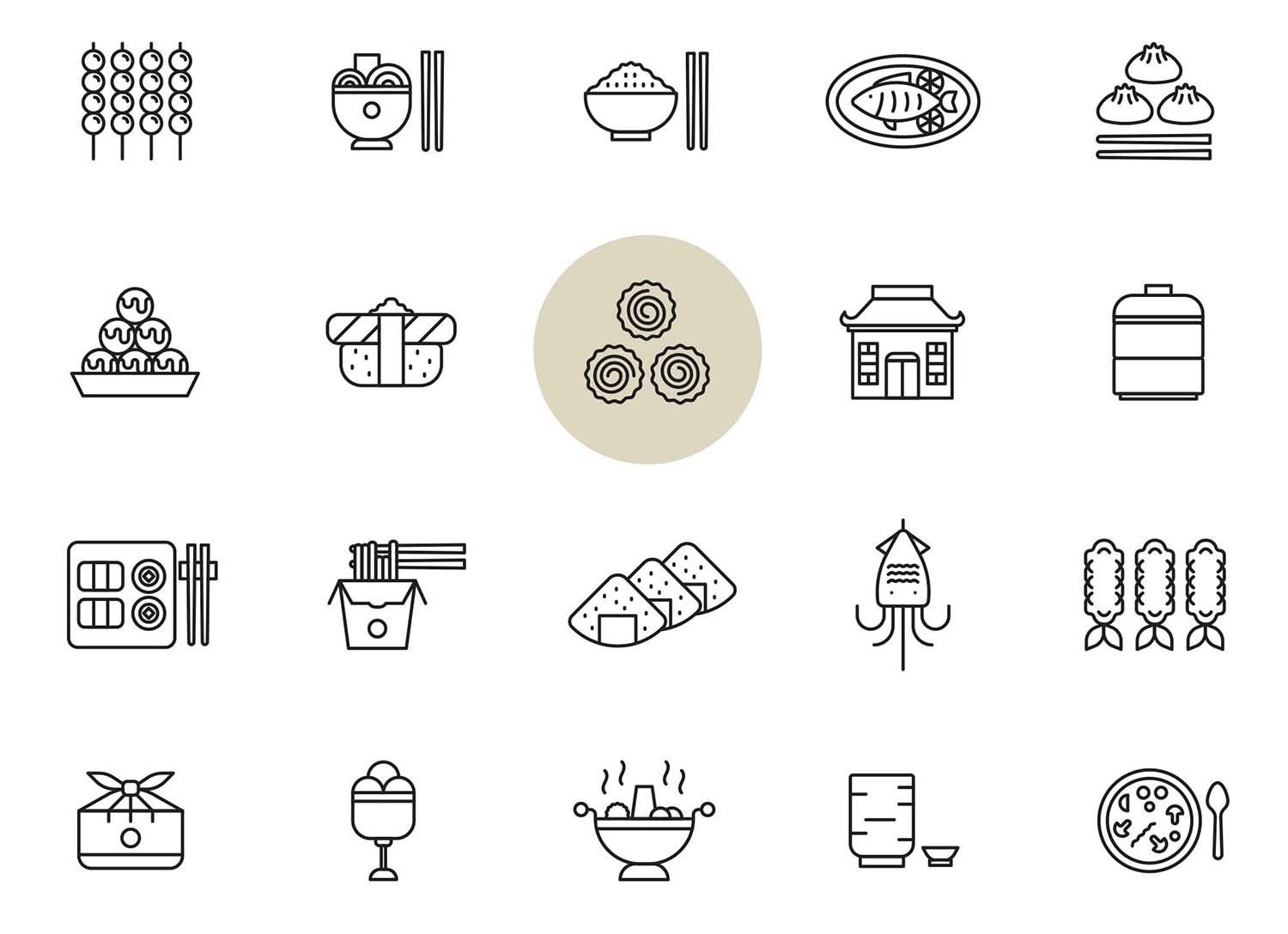 Asian Food Icons is a set of 20 vector monochrome icons that depict various foods and dishes of Asian cuisine. You can use this set to implement any of your design projects on the relevant topics. Use this kit to create food posters, branding, invitations, cards, clothing prints, and more.