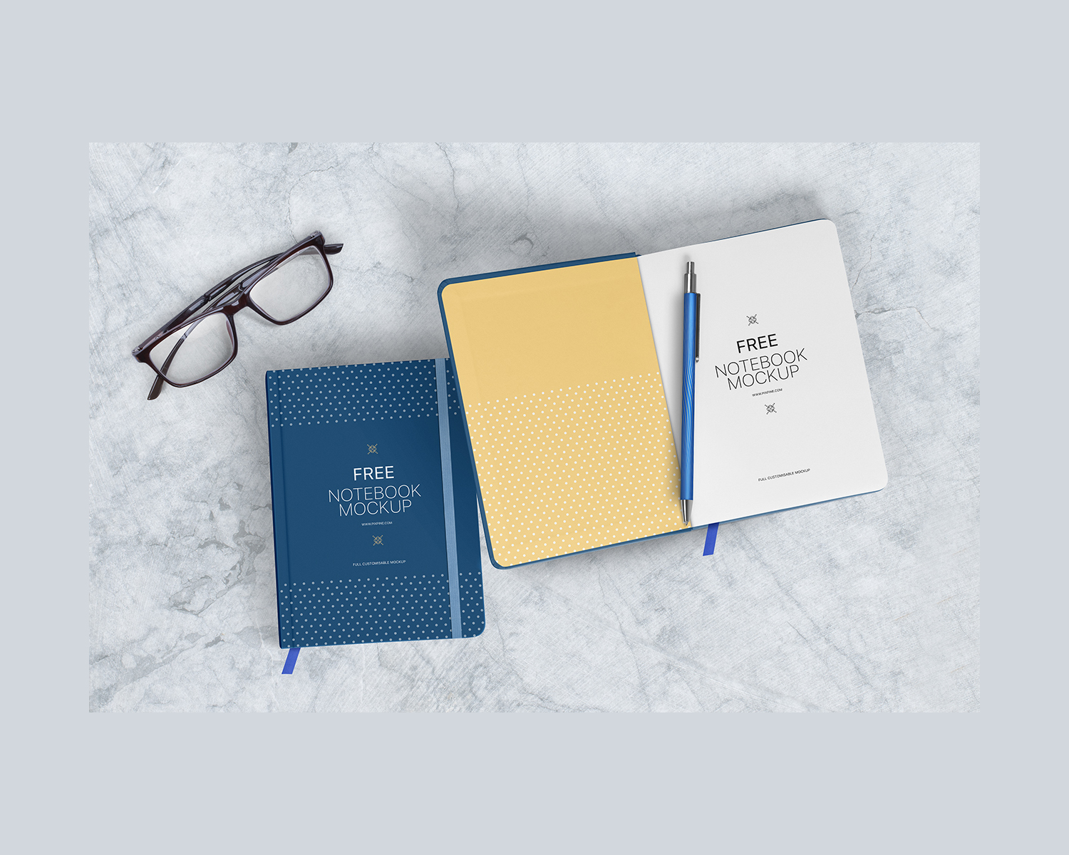 The Free Notebook Mockup is a scene of two notebooks and glasses on a marble surface. This mockup will help you showcase your corporate identity design realistically on your notebook. You can easily edit this mockup with smart object layers. You can customize each part of the notebooks, and change the background color or place your own background image. Feel free to download and use it in your personal and commercial projects.