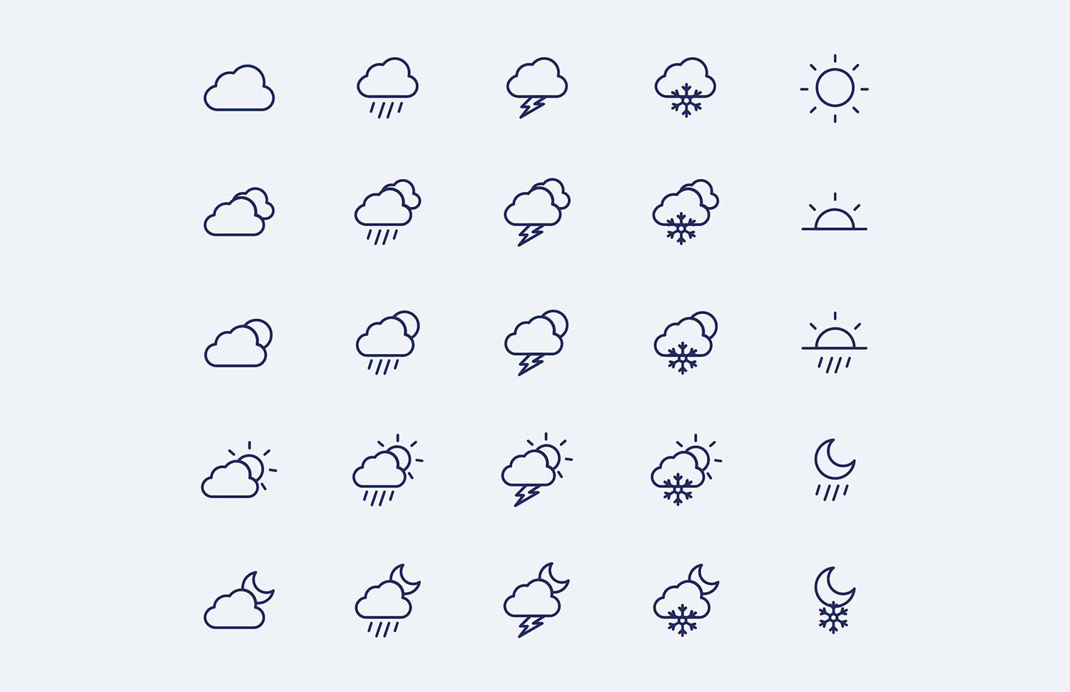 Free Weather Vector Icons is a set of 25 high-quality vector icons made in a minimalist style depicting different weather conditions. This set is perfect for creating various design projects related to the weather. These can be posters, postcards, flyers, prints, and more. Also, this set is well suited for use in the graphical interface of mobile applications on the relevant topic.