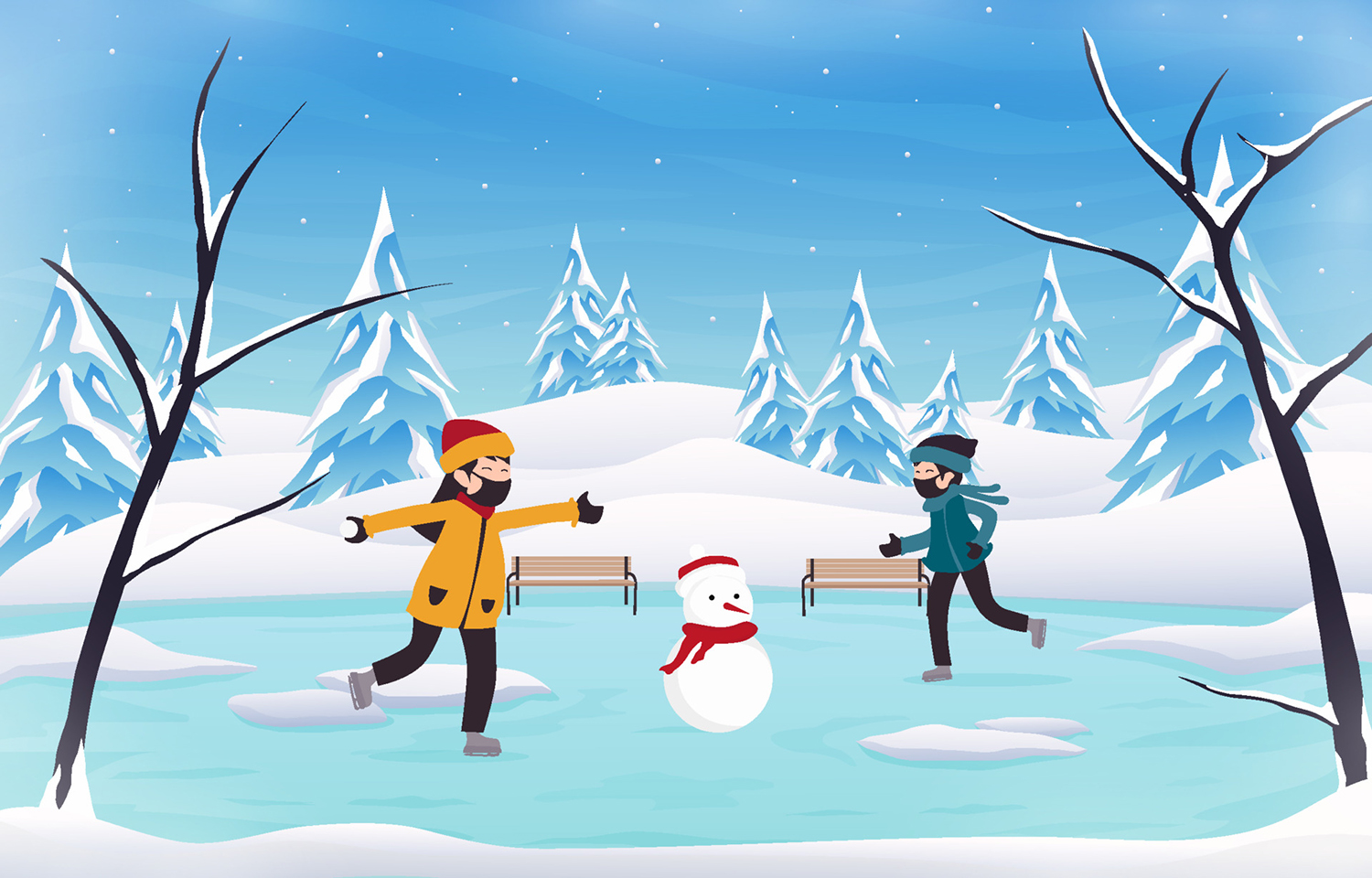 Happy Kids Playing in a Winter Illustration is a beautiful bright interesting vector illustration on a winter theme that will fill many of your design projects with a winter mood. This illustration works very well for holiday posters, cards, branding, invitations, prints, and more. Improve your professional level with this vector illustration.