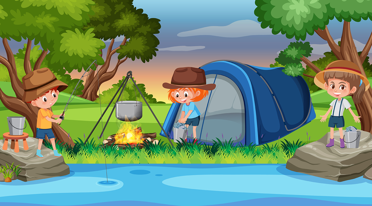 Kids Camping by the Water Illustration is an interesting high-quality vector illustration that will fill your design projects with a sunny summer atmosphere of rest and vacations in nature. You can use this illustration to create travel posters, cards, invitations, branding, flyers, prints, and more.