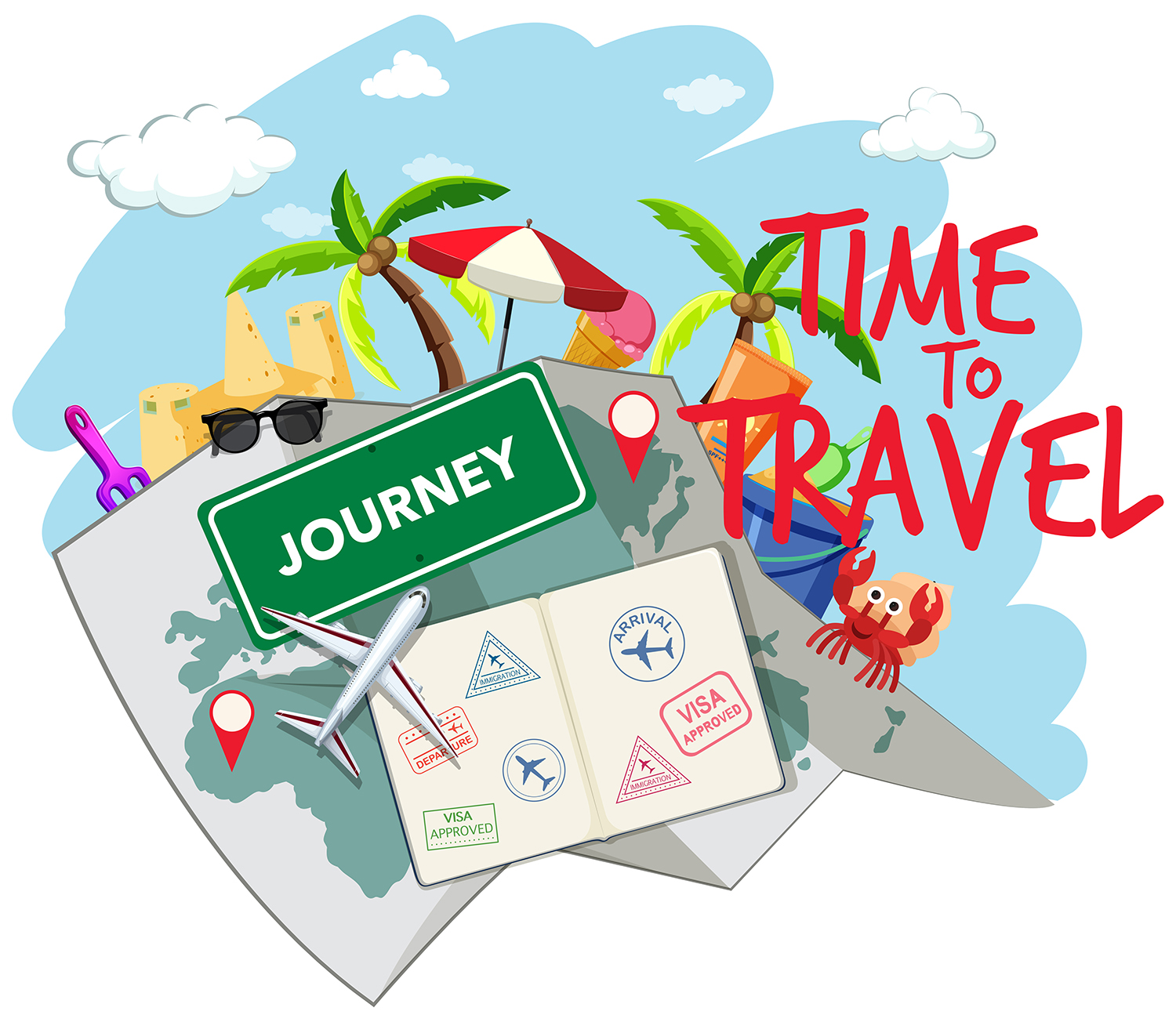Time to Travel Illustration is a beautiful high-quality vector illustration that is filled with summer travel mood and depicts various attributes associated with tourism. This illustration works very well for a variety of travel-related design projects. These can be travel posters, flyers, postcards, invitations, prints, and more.