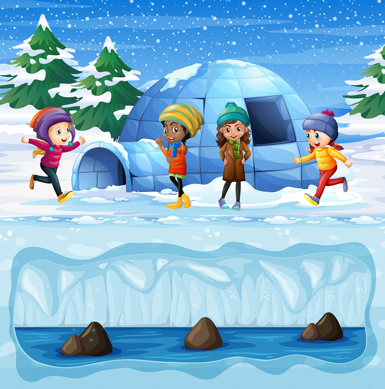Young Girls Playing in front of Igloo Illustration is a beautiful bright interesting vector illustration on a winter theme that will fill many of your design projects with a winter mood. This illustration works very well for holiday posters, cards, branding, invitations, prints, and more. Improve your professional level with this vector illustration.